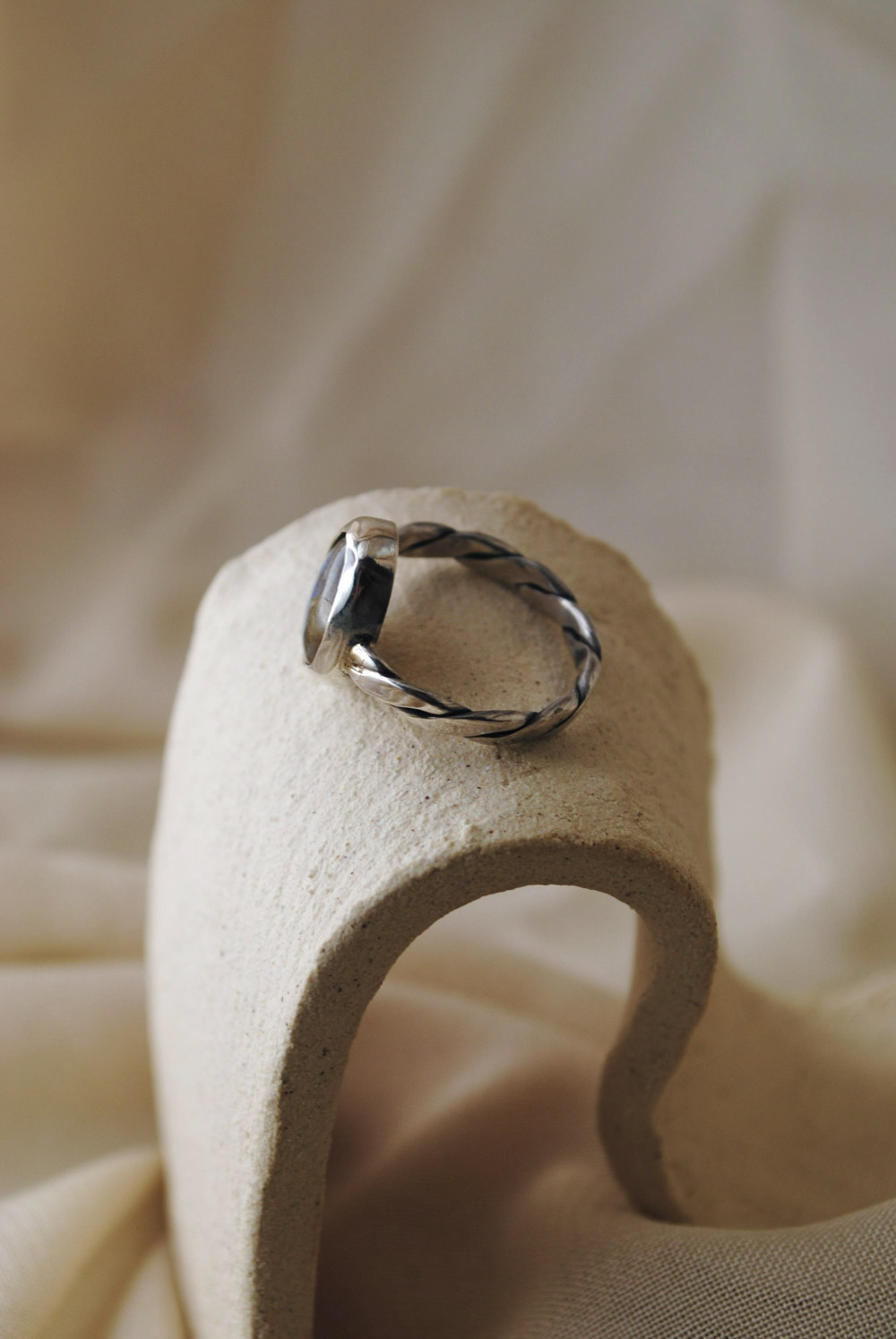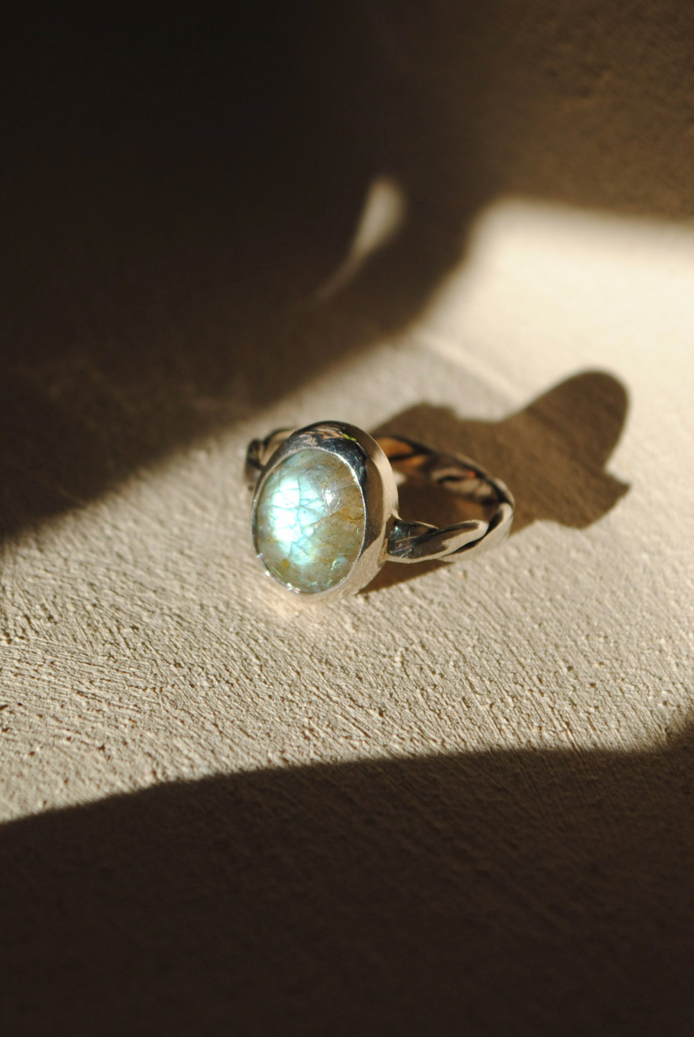 Anillo sencillo realizado en plata de ley 925 y protagonizado por una piedra labradorita ovalada. El brazo está formado por un doble hilo entorchado que le otorga una gran personalidad a este sencillo diseño. Es una pieza básica ideal para combinar con otros anillos. Este anillo es un diseño original y una pieza única, no hay dos iguales. Si te ha gustado este diseño y te gustaría verlo con otras piedras o en otra talla puedes realizar un encargo personalizado y lo diseñamos juntas.