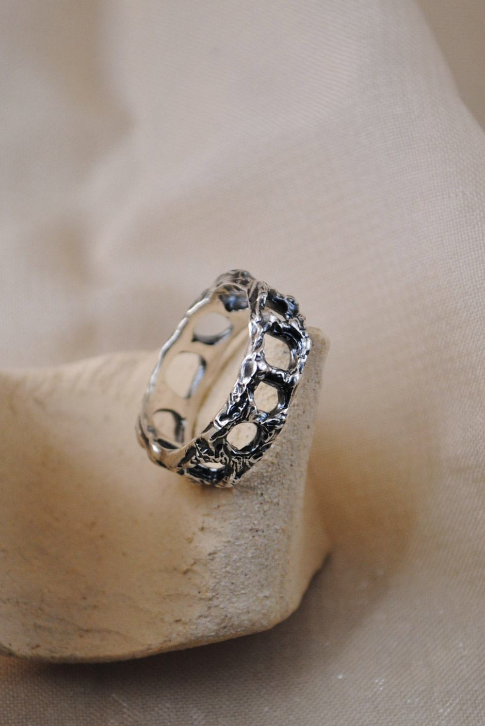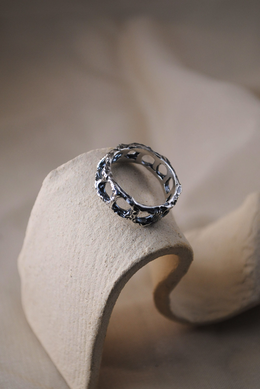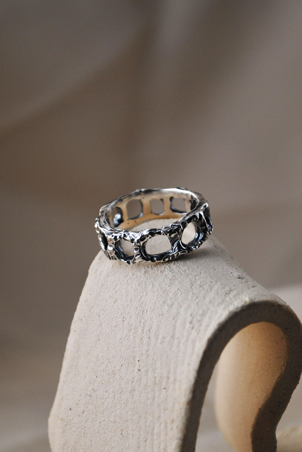 Anillo de plata de ley 925 texturizado con acabados en óxido y plata brillante. Cordada es un diseño original y una pieza única, no hay dos igual.