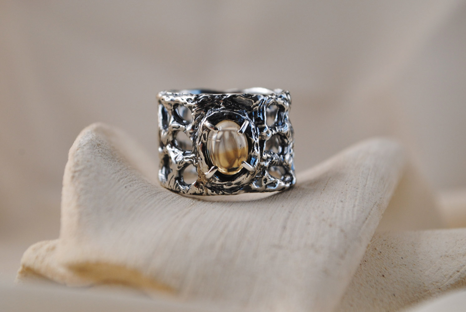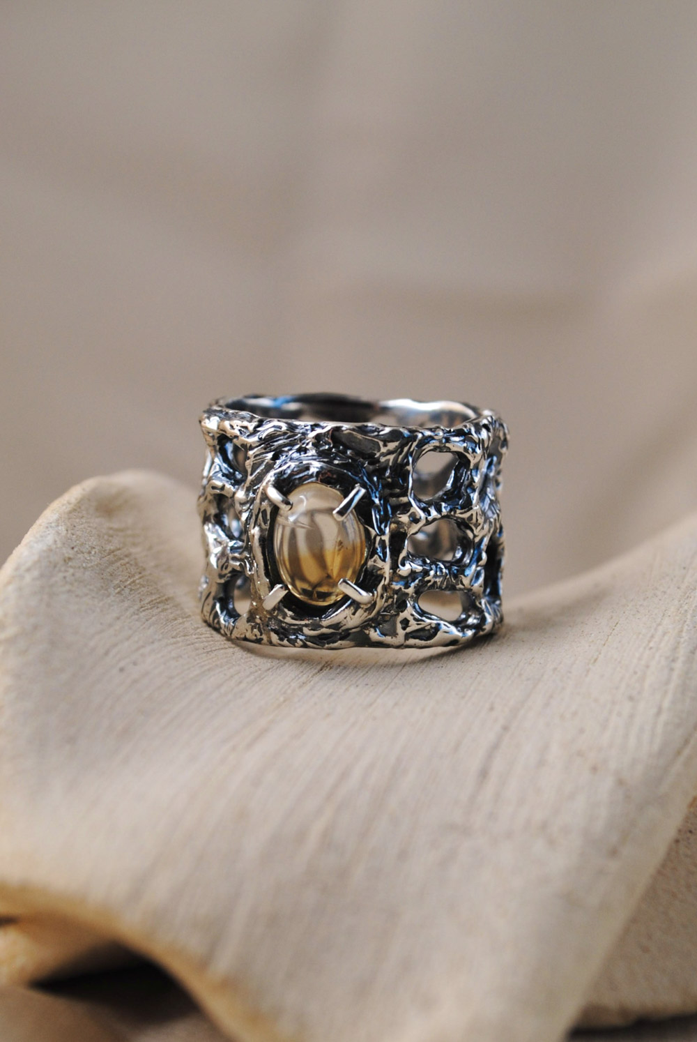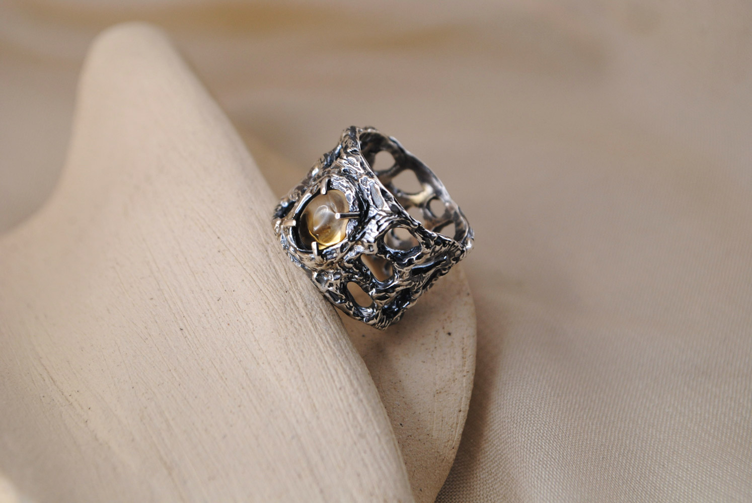 Mauna es una pieza única con un diseño grueso y espacios calados. En el centro luce un cabujón de cuarzo citrino ovalado. Es un anillo trabajado artesanalmente en plata de ley 925 con un acabado óxido en algunas partes y brillo en otras, dándole un efecto de volumen y una textura espectacular.