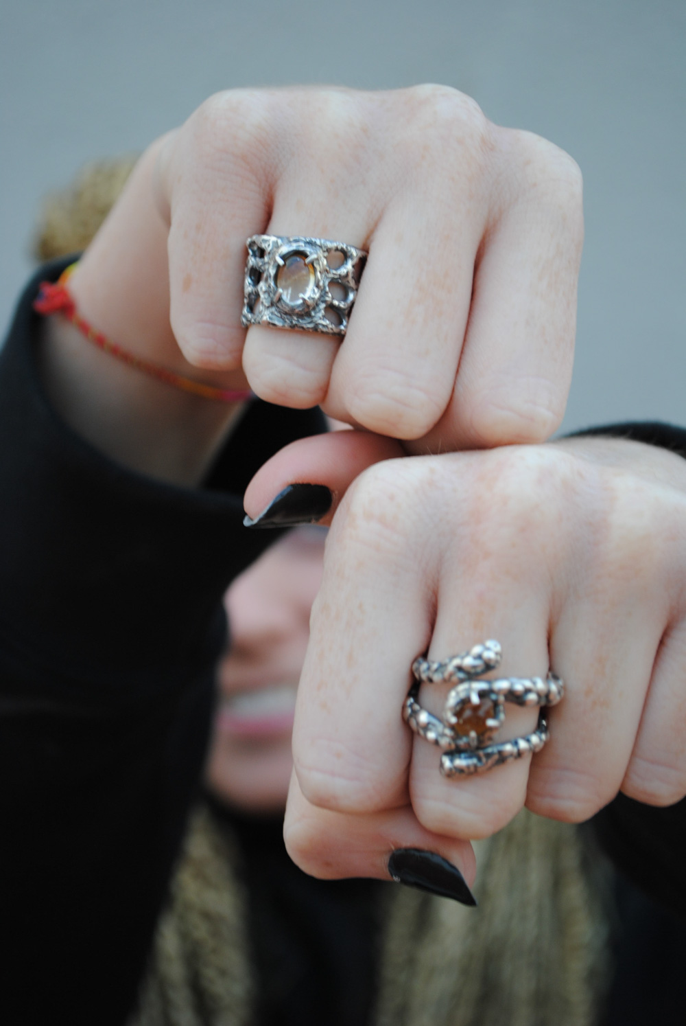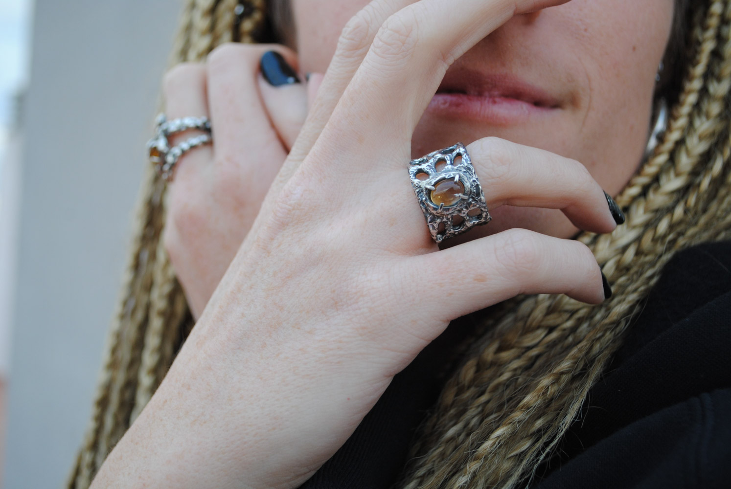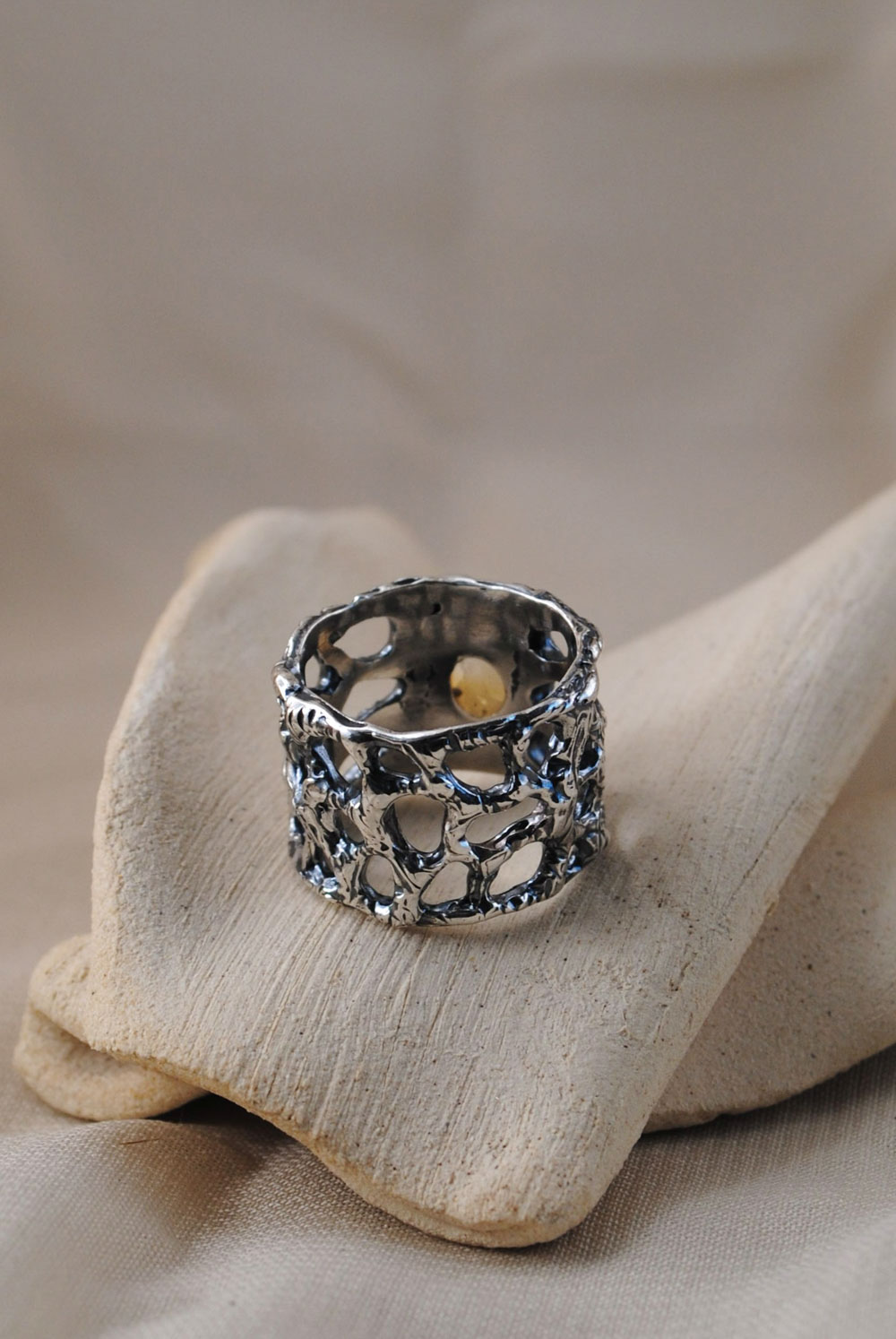Mauna es una pieza única con un diseño grueso y espacios calados. En el centro luce un cabujón de cuarzo citrino ovalado. Es un anillo trabajado artesanalmente en plata de ley 925 con un acabado óxido en algunas partes y brillo en otras, dándole un efecto de volumen y una textura espectacular.