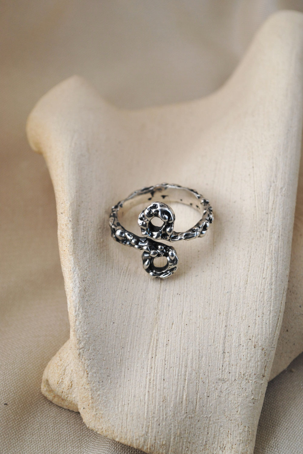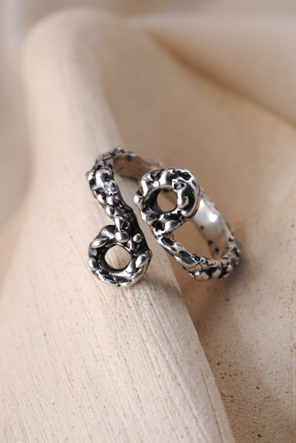 Anillo de plata de ley 925 texturizado con acabados en óxido y plata brillante. Vesubio es un diseño original y una pieza única, no hay dos igual. Al tratarse de un diseño cruzado abierto se puede encargar en diferentes tallas variables entre la 15 y la 20. Según la talla seleccionada el diseño variará ligeramente, quedando más cerrado en las tallas más pequeñas o más abierto en las tallas más grandes.