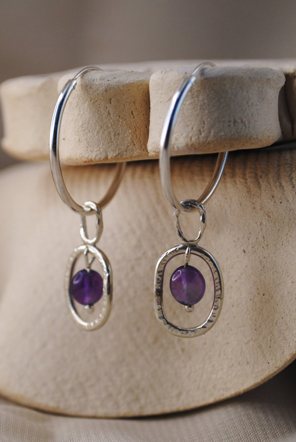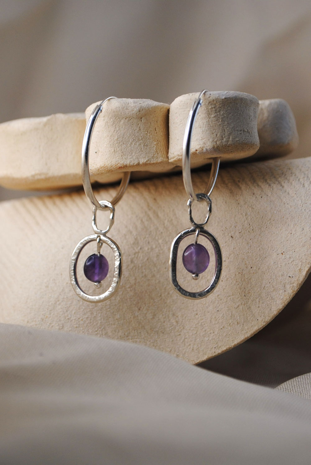 Pendientes de aro criolla con colgante de plata de ley 925 con una mini cuenta de amatista en el centro. Acabado plata en brillo con textura martelé. El precio incluye los aros y puedes seleccionar su tamaño. Estas gotas de amatista son una pieza única, si deseas tener tus gotas personalizadas puedes hacer un encargo con la piedra que más te guste y el tamaño que decidas.
