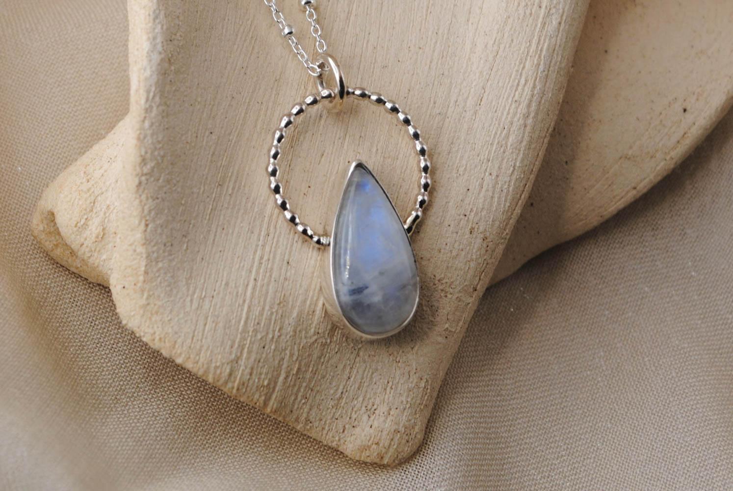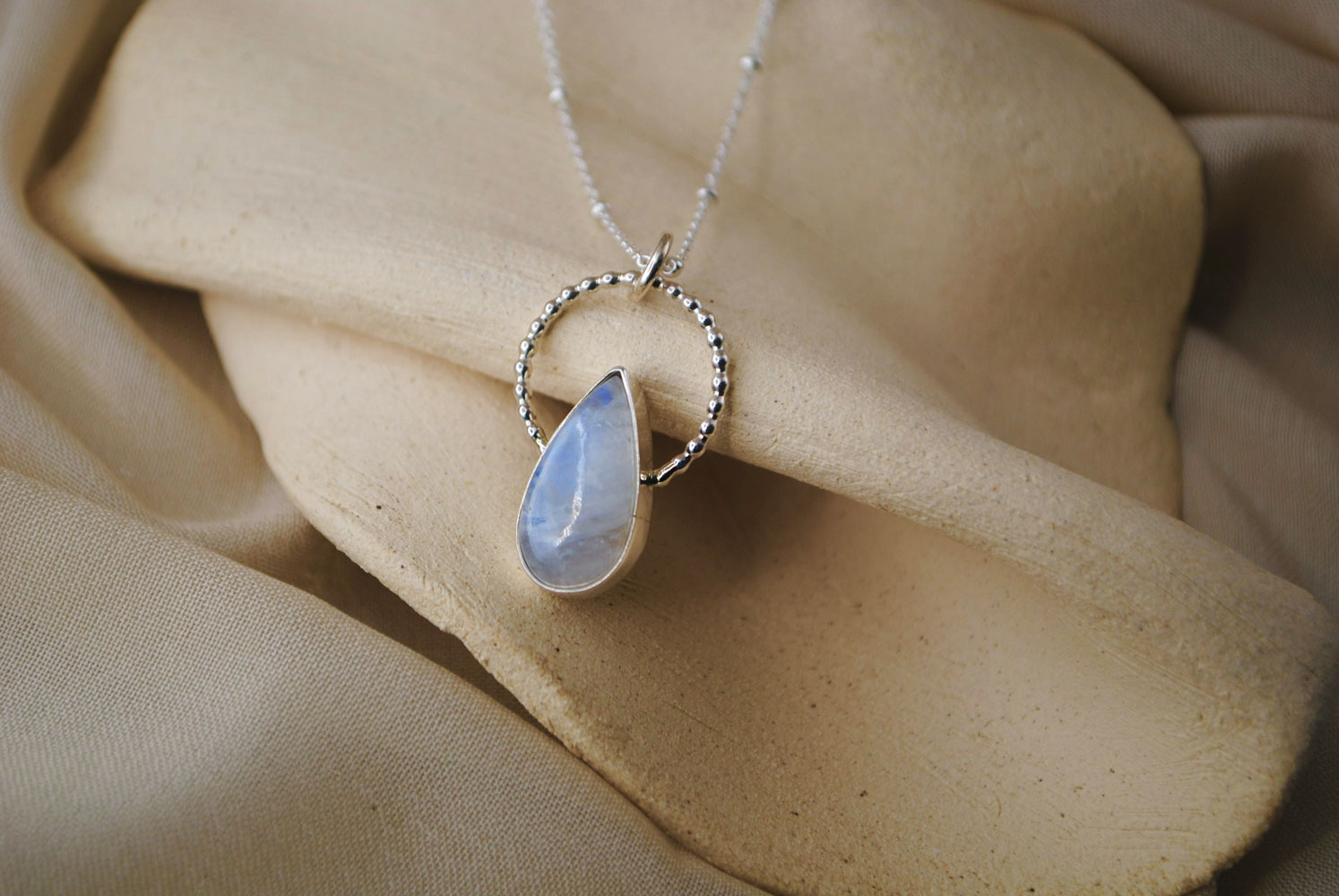 Colgante de plata de ley 925 con labradorita blanca, conocida como piedra luna. La protagonista de la pieza es un cabujón de piedra luna en forma de gota con unos reflejos muy especiales. Es una pieza sencilla y cautivadora que atrapa la luz de forma única, revelando suaves destellos iridiscentes con cada movimiento. La labradorita blanca es conocida por su misterioso brillo nacarado, que refleja tonalidades suaves de azul y verde. Esta pieza incluye una cadena, puedes seleccionar el tamaño en las opciones. Aurora es un diseño original y una pieza única, no hay dos iguales. Si te ha gustado este diseño y te gustaría verlo con otras piedras puedes realizar un encargo personalizado y lo diseñamos juntas.