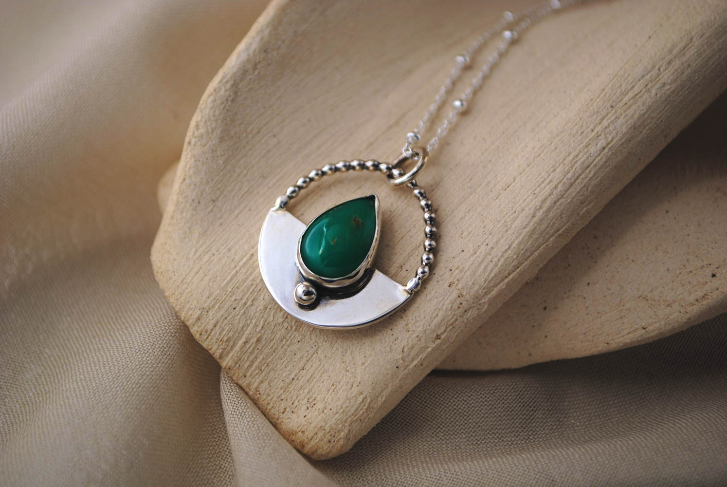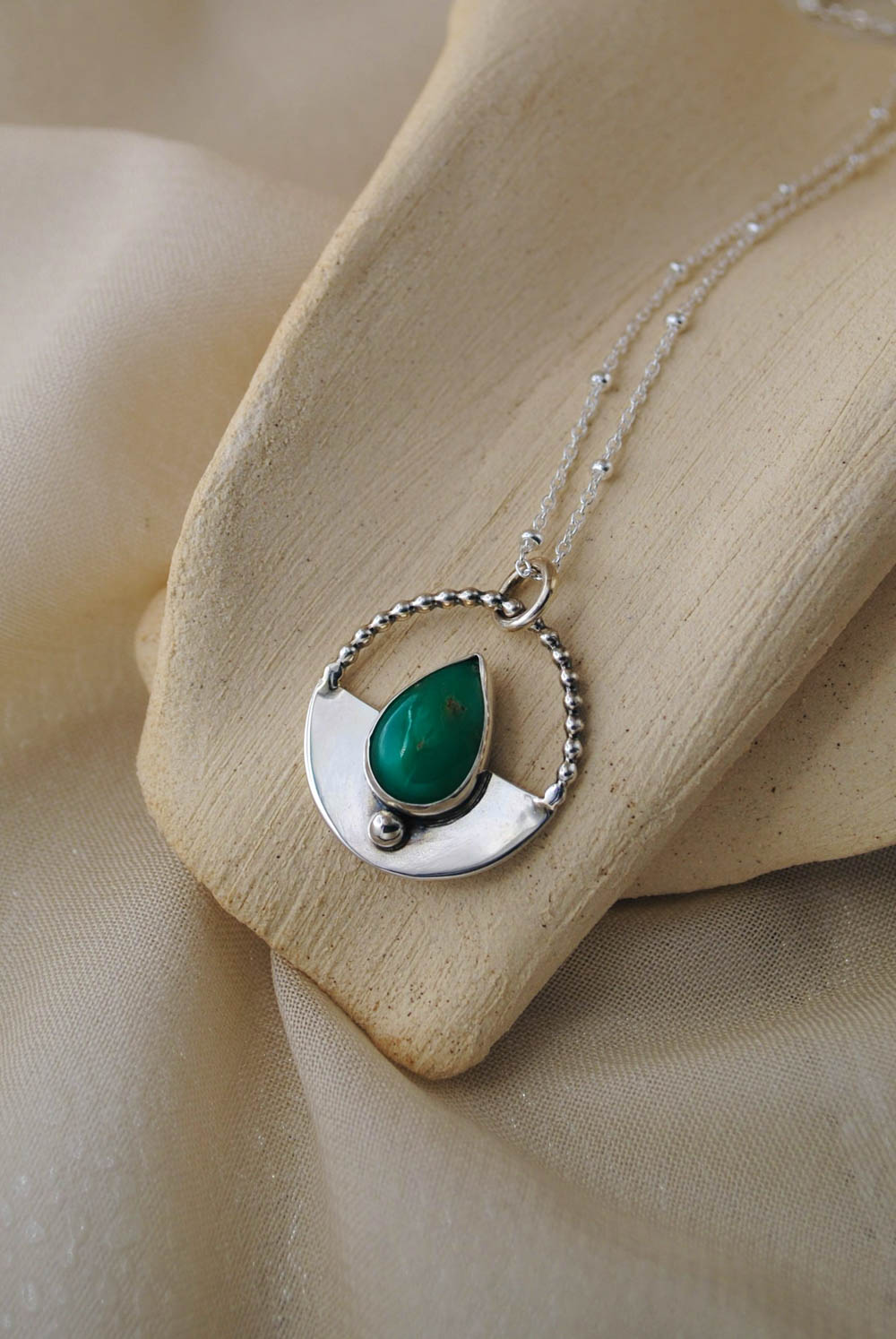 Este colgante está elaborado en plata de ley 925 y presenta una hermosa piedra crisoprasa, conocida por su vibrante tonalidad verde. La piedra en forma de gota está enmarcada por un elegante diseño de aro de plata con bolitas. La combinación de la suave curvatura metálica con la intensidad verde de la crisoprasa crea una pieza equilibrada y armoniosa. Esta pieza incluye una cadena, puedes seleccionar el tamaño en las opciones. Ciclo es un diseño original y una pieza única, no hay dos iguales. Si te ha gustado este diseño y te gustaría verlo con otras piedras puedes realizar un encargo personalizado y lo diseñamos juntas.