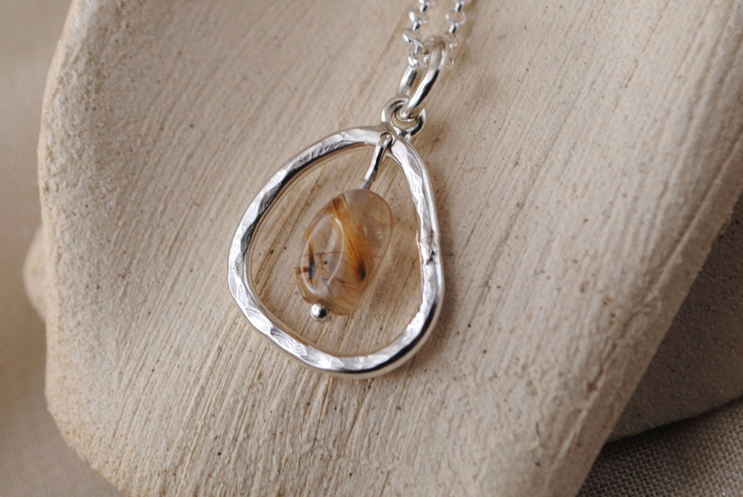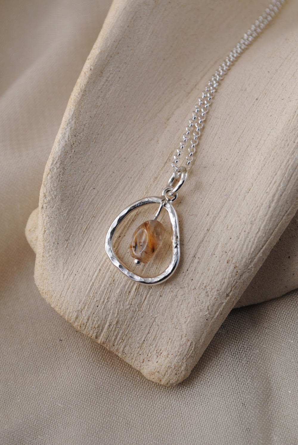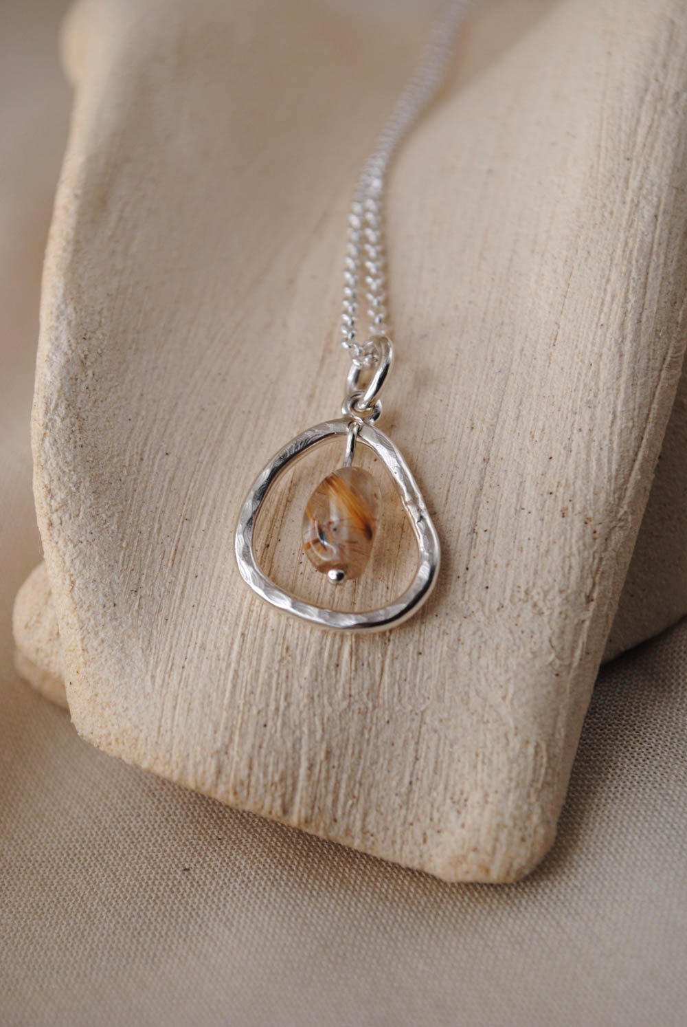 Colgante de plata de ley 925 con un mini canto rodado en el centro. Acabado plata en brillo con textura martelé. Esta gota de cuarzo rutilado es una pieza única, si deseas tener tu gota personalizada puedes hacer un encargo con la piedra que más te guste y el tamaño que decidas. El precio incluye la cadena.