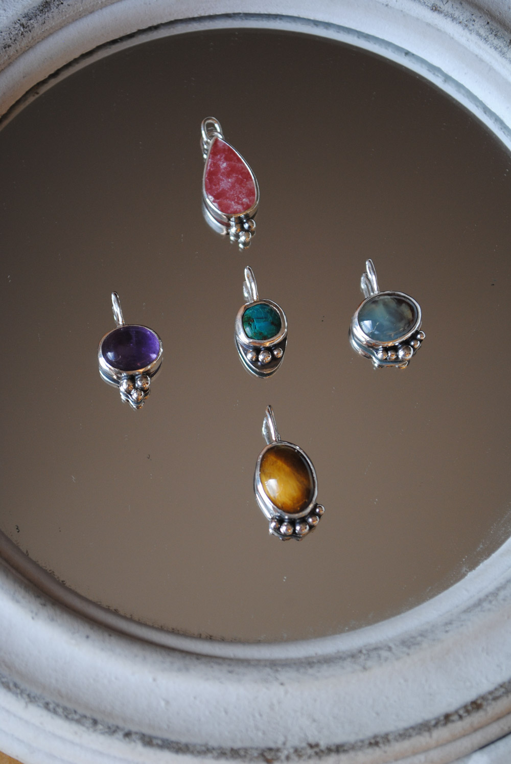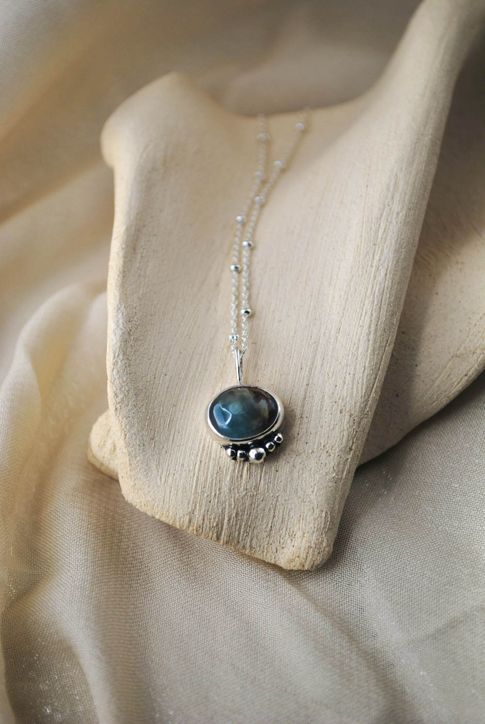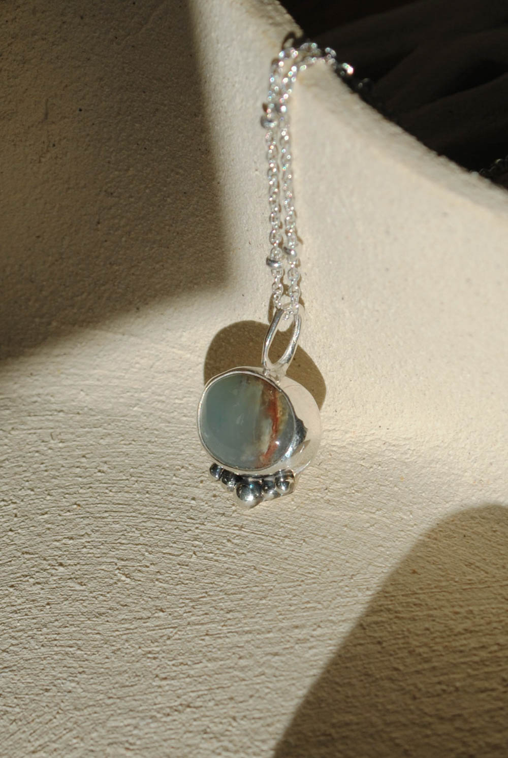 Colgante de plata de ley 925 con un ópalo andino y detalle de bolitas. Esta piedra destaca por su cuerpo translúcido y los tonos azules y tierra que hacen de cada cabujón una pieza única. Esta pieza incluye una cadena, puedes seleccionar el tamaño en las opciones.