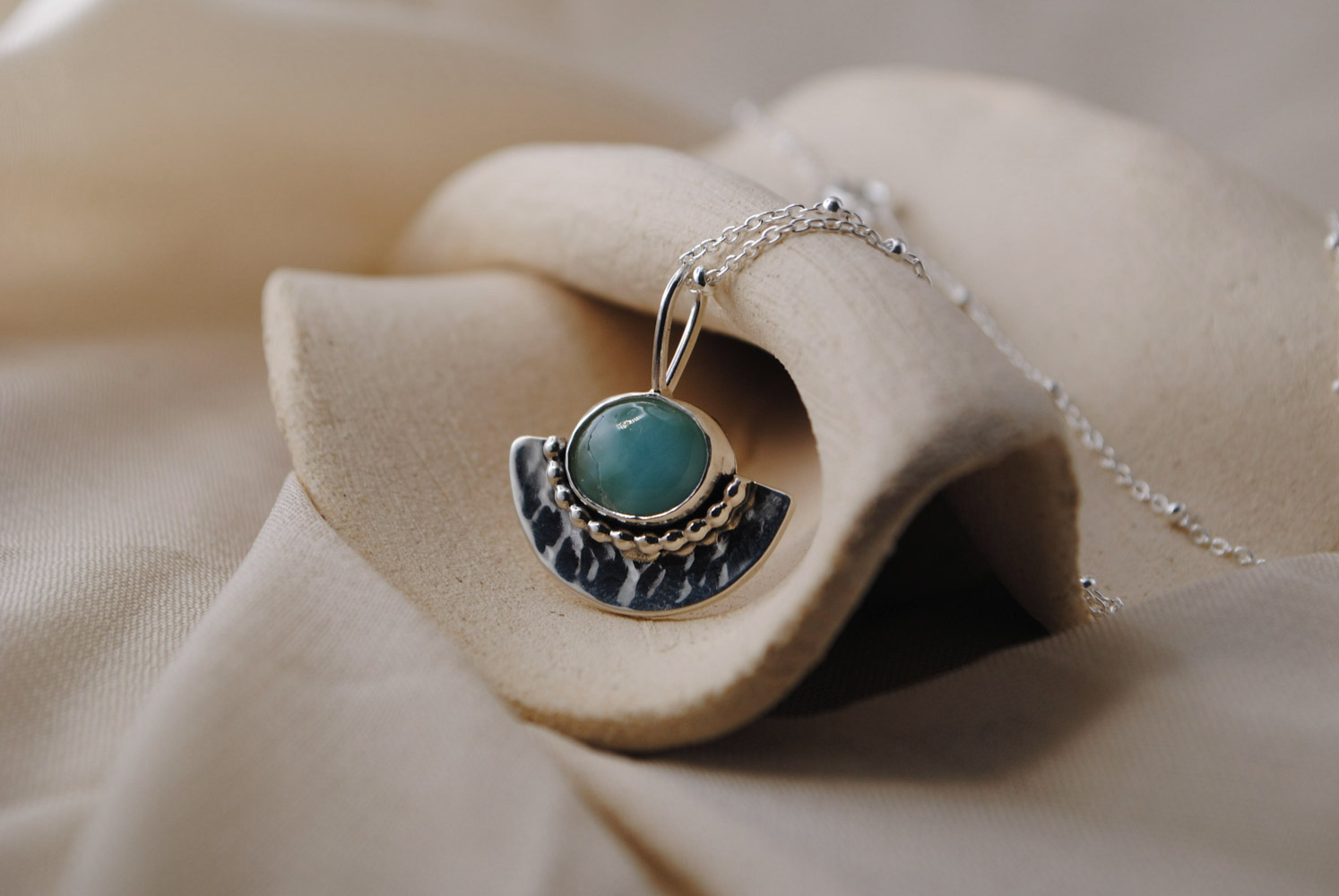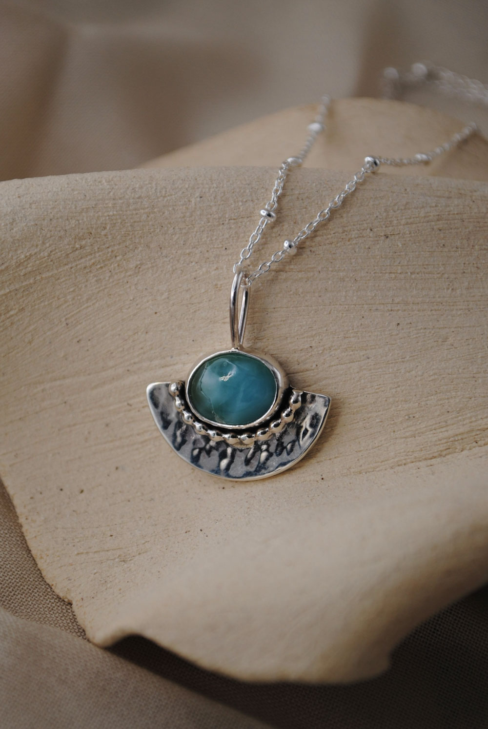 Colgante de plata de ley 925 con piedra larimar ovalada. Esta preciosa larimar destaca por su color azul que nos transporta al mar Caribe de la República Dominicana, el único lugar dónde se encuentra este mineral. Samaná es un diseño original y una pieza única, no hay dos iguales. Esta pieza incluye una cadena, puedes seleccionar el tamaño en las opciones.