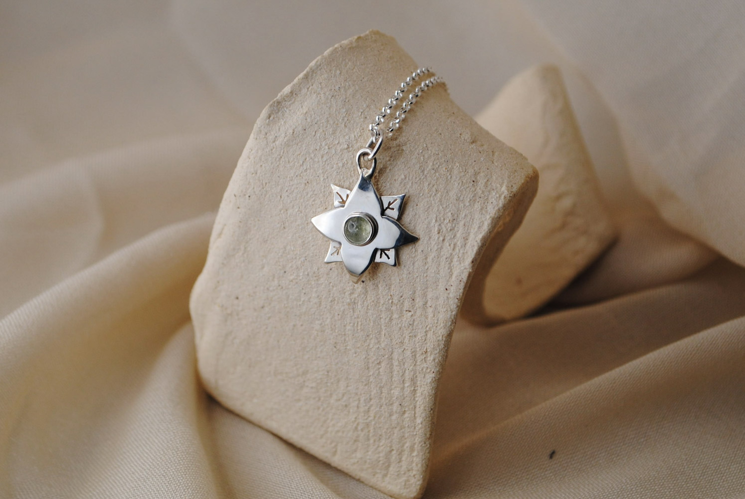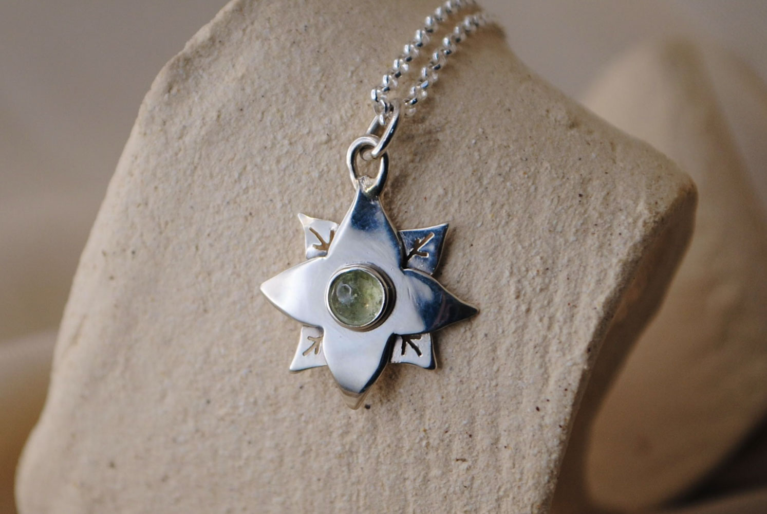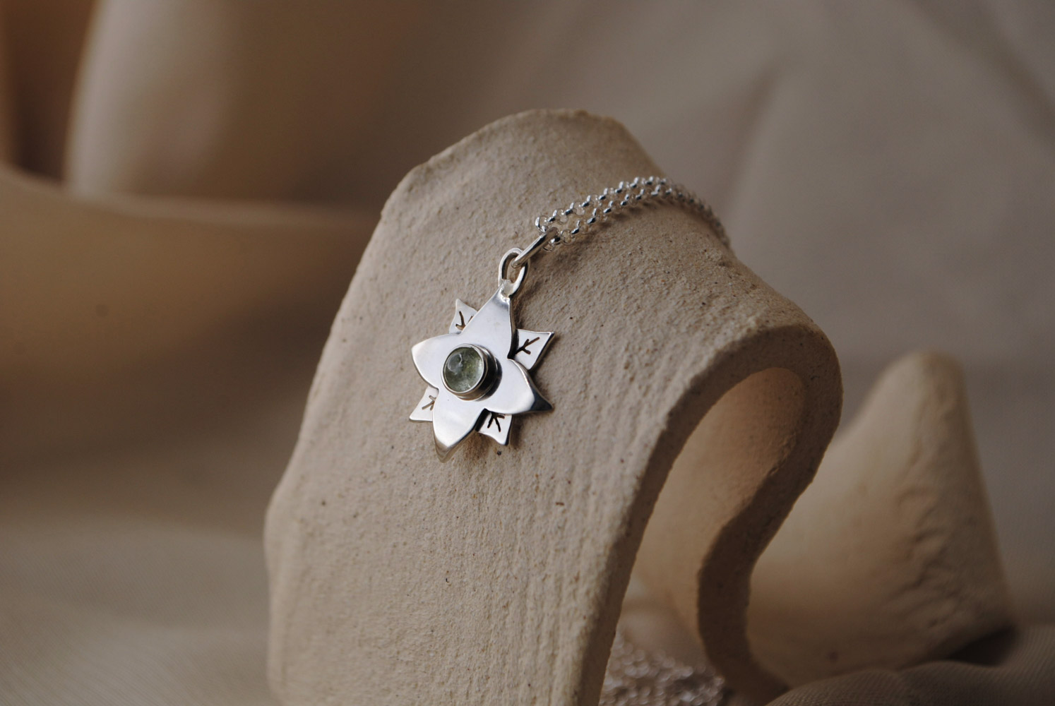 Colgante de plata de ley 925 con un diseño de flor que luce una pequeña verdelita en el centro. La turmalina, con su brillo suave y natural, es cuidadosamente engastada para resaltar su pureza y luminosidad. Este colgante es una pieza única y no hay dos iguales, si te gustaría ver este diseño con otra piedra y otras dimensiones puedes dejar volar tu imaginación y realizar un encargo personalizado.