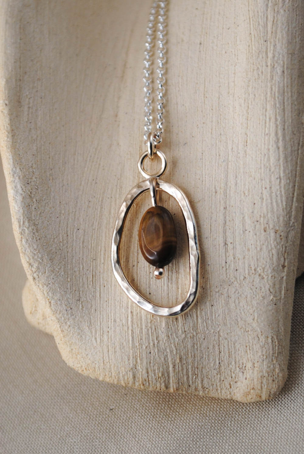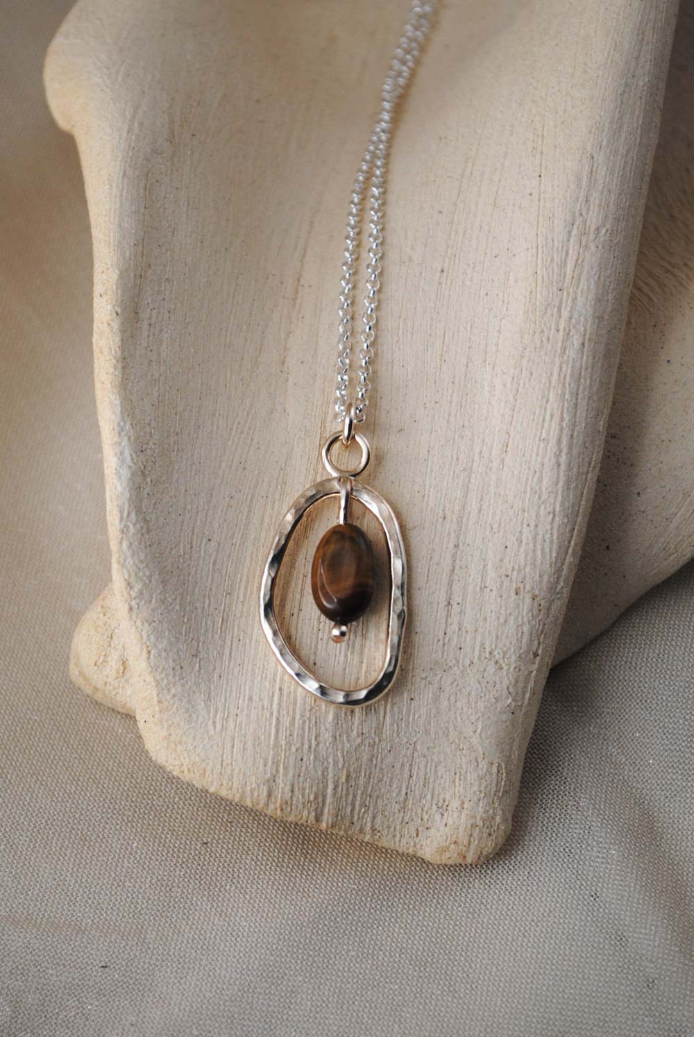 Colgante de plata de ley 925 con un mini canto rodado en el centro. Acabado plata en brillo con textura martelé. Esta gota de ojo de tigre es una pieza única, si deseas tener tu gota personalizada puedes hacer un encargo con la piedra que más te guste y el tamaño que decidas. El precio incluye la cadena.