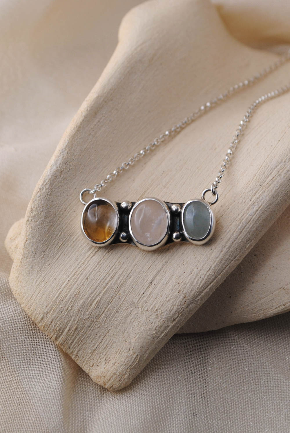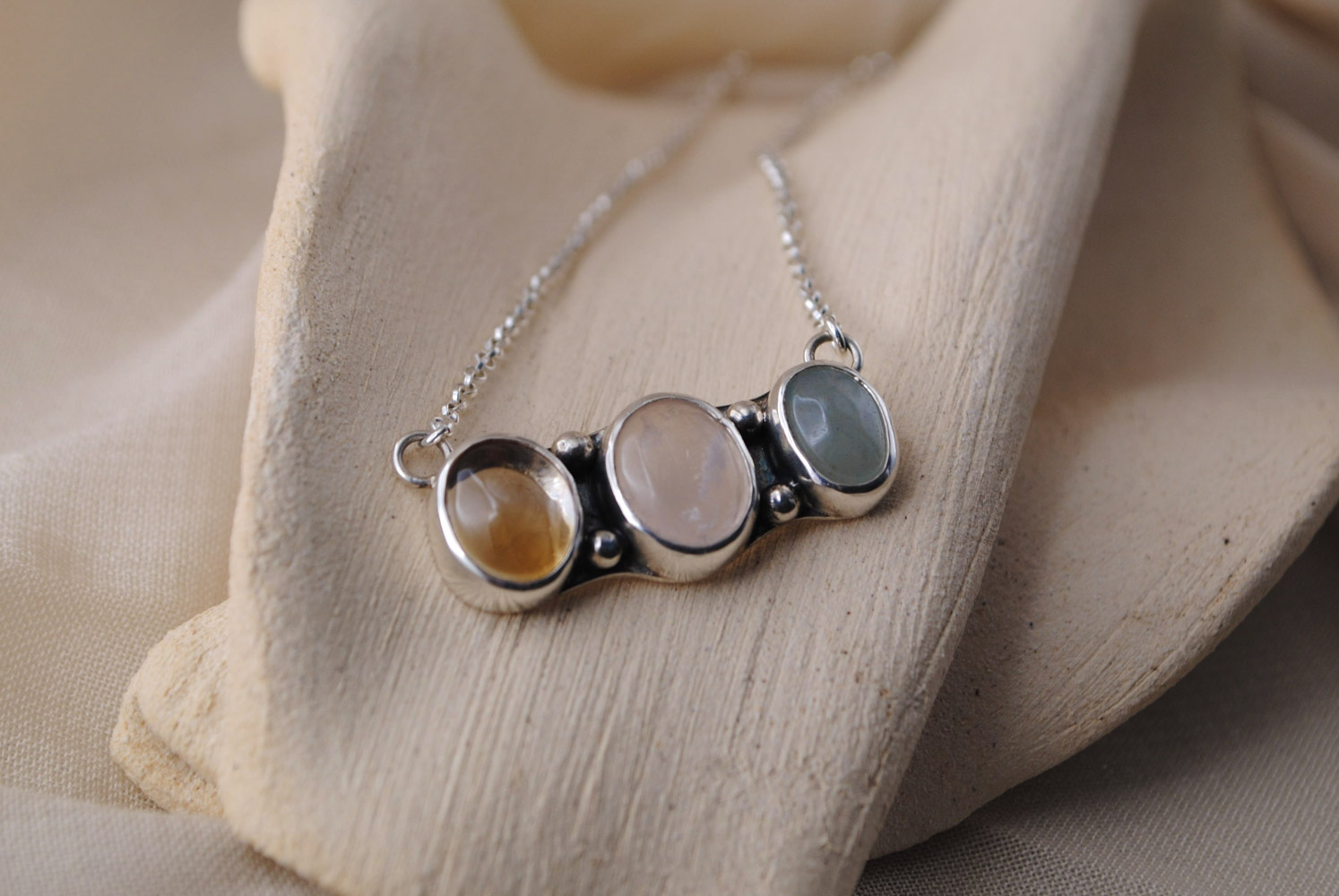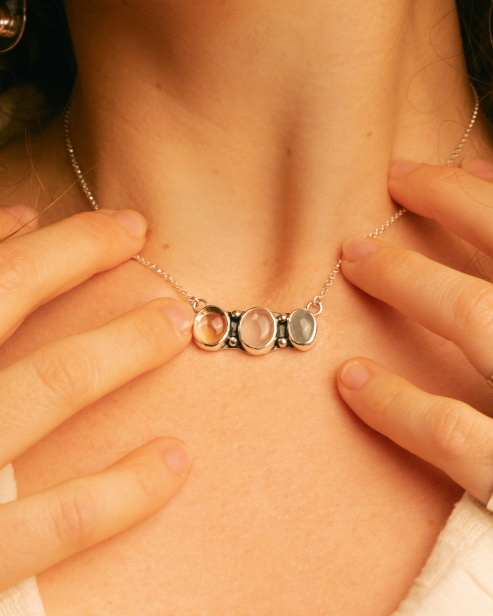 La gargantilla sunset está formada por tres hermosas piedras de colores pastel que recuerdan a los tonos suaves del cielo al atardecer. Están asentadas en un diseño de plata de ley con detalles de bolitas y huecos en óxido para resaltar la belleza de la pieza. Es un diseño minimalista y discreto en el cual las piedras son las indiscutibles protagonistas. La cadena es abierta y tiene 3 niveles de cierre para ajustar la largura del cuello a la altura que más te guste. Sunset es un diseño original y una pieza única, no hay dos iguales. Si te ha gustado este diseño y te gustaría verlo con otras piedras puedes realizar un encargo personalizado y lo diseñamos juntas.