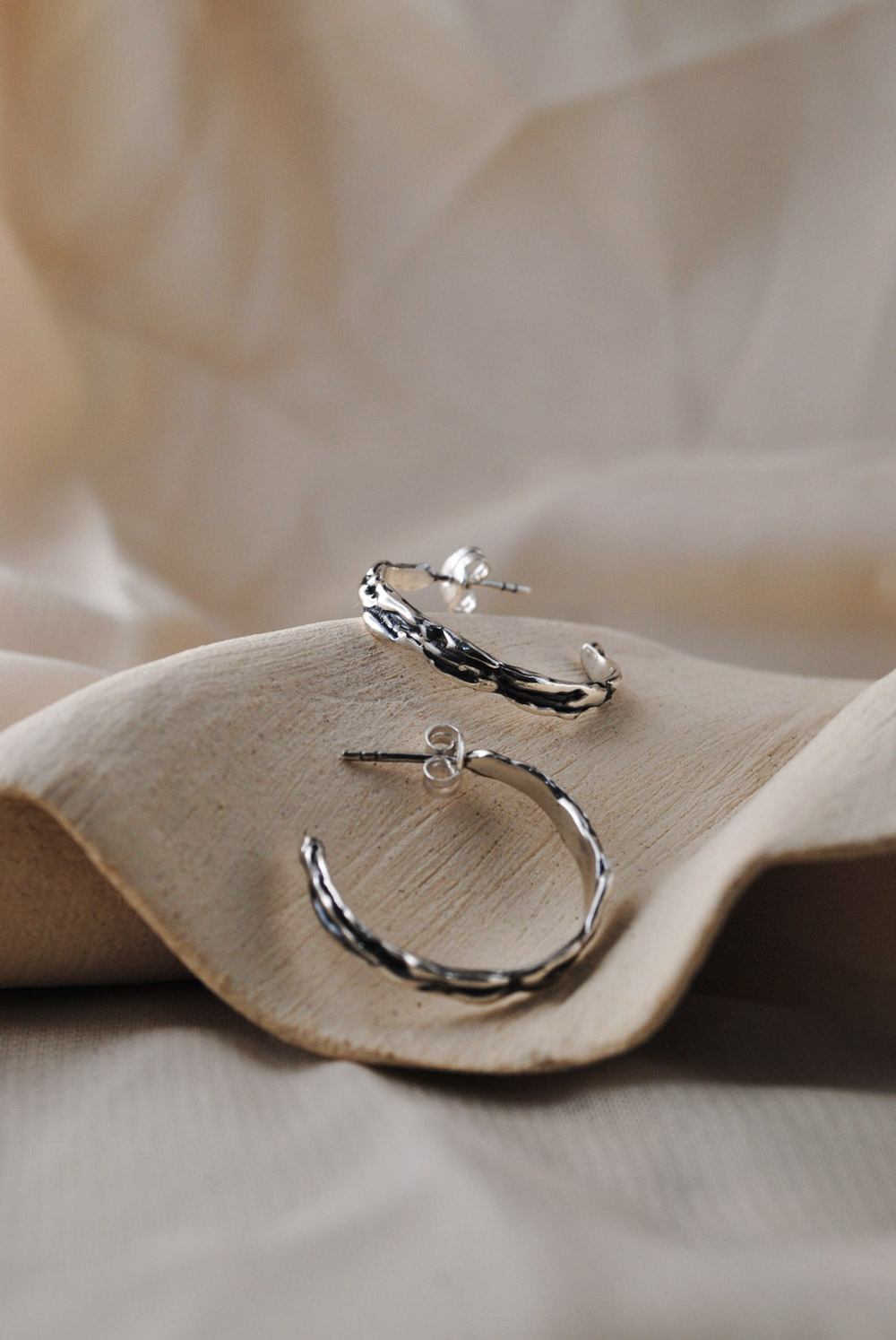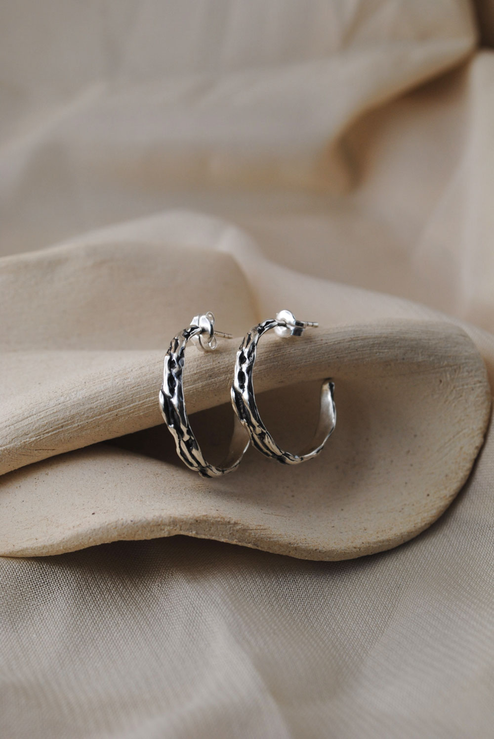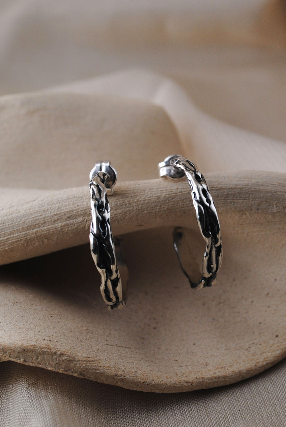 Pendientes con cierre de presión. Estos pendientes presentan un diseño escultórico en plata, con una forma orgánica que recuerda a las cavidades naturales de una piedra erosionada. Su superficie suavemente curvada está perforada por aberturas asimétricas, creando un interesante juego de luces y sombras. El tamaño compacto de los pendientes se adapta perfectamente al lóbulo.. Disponibles en plata 925 con acabados en óxido o latón bañado en 2 micras de oro.