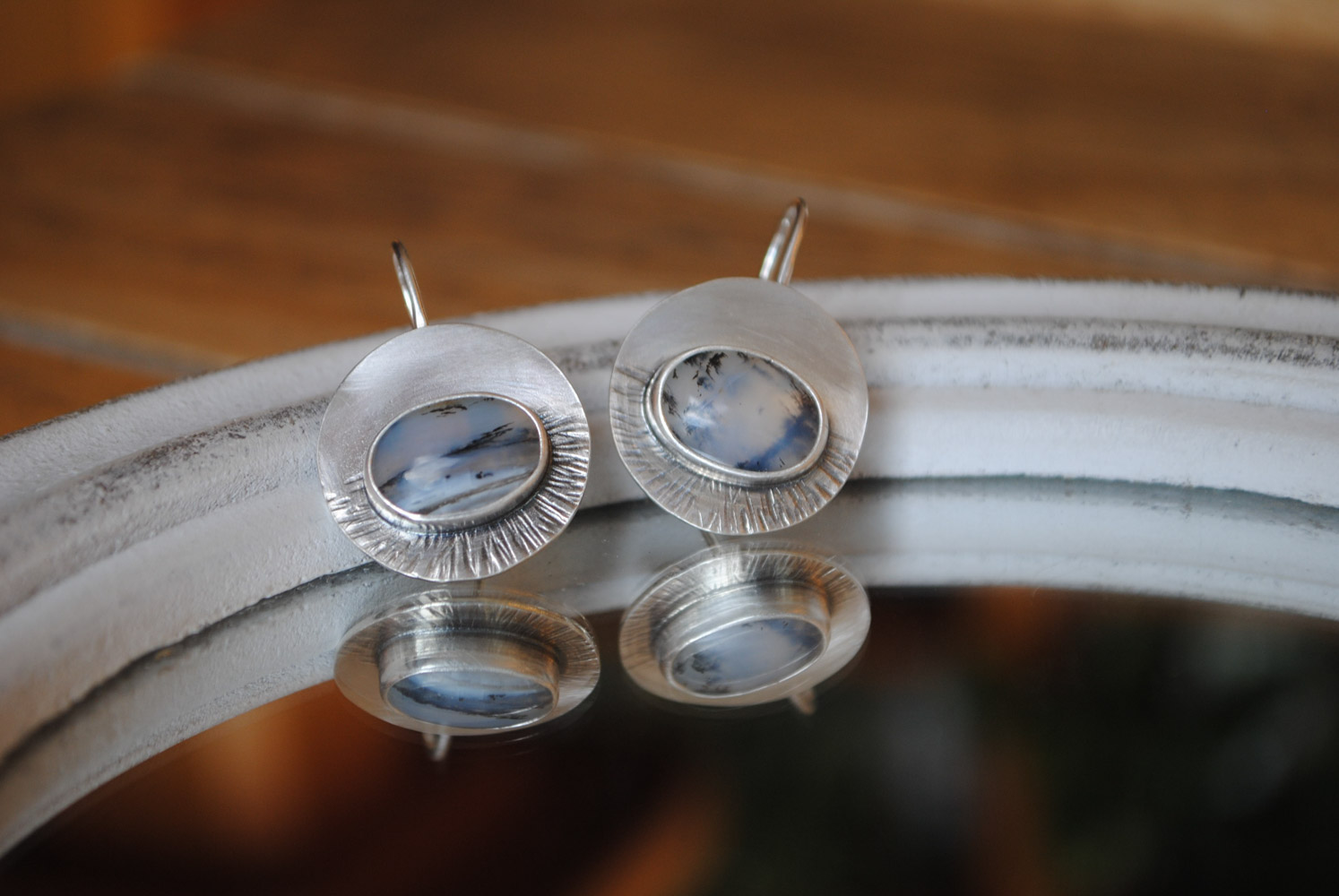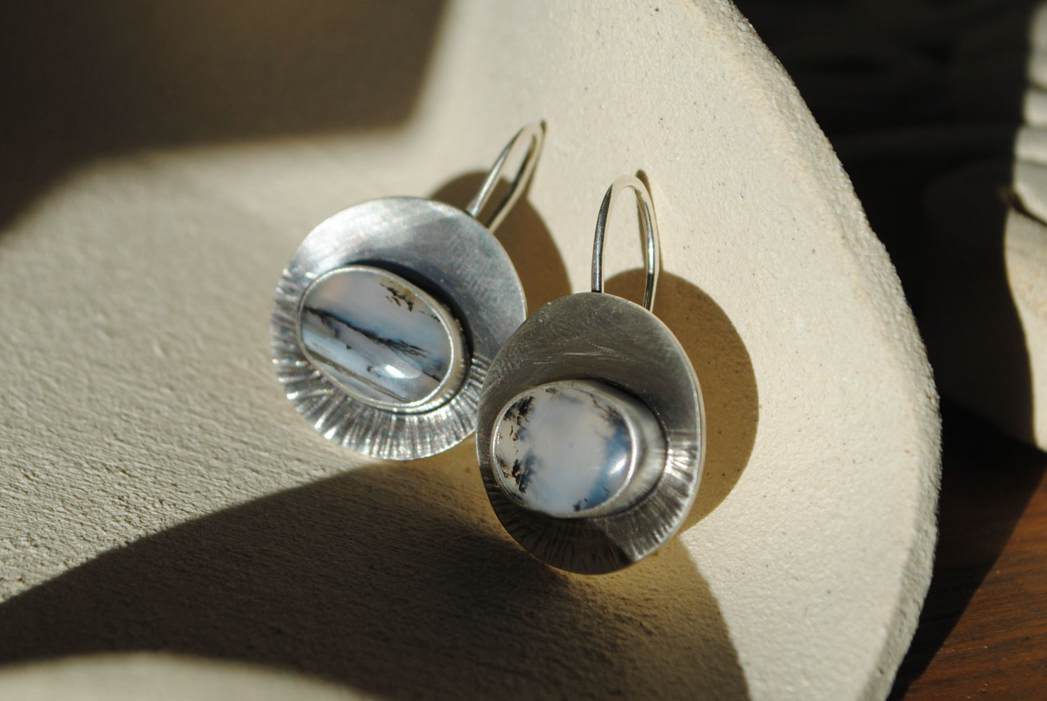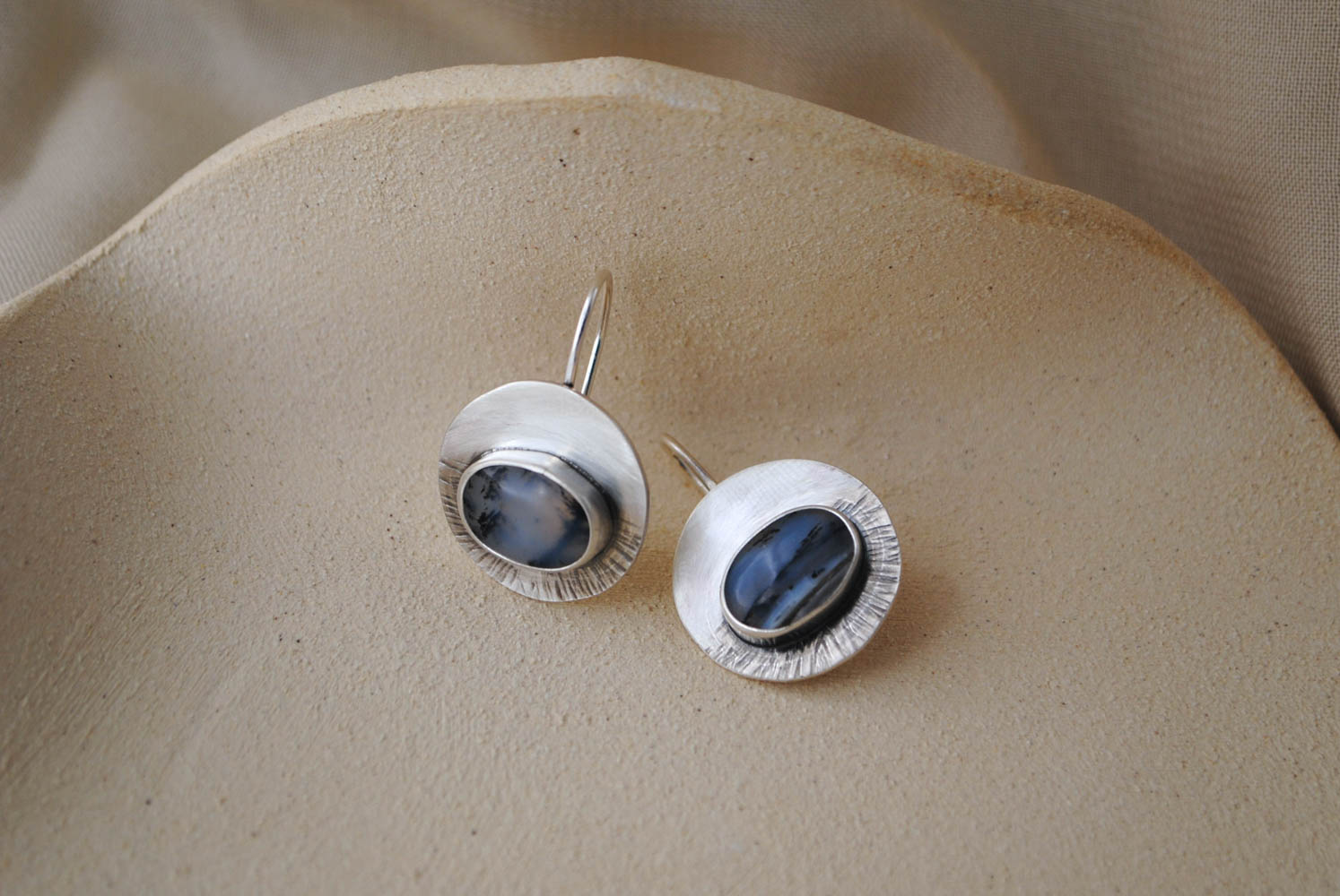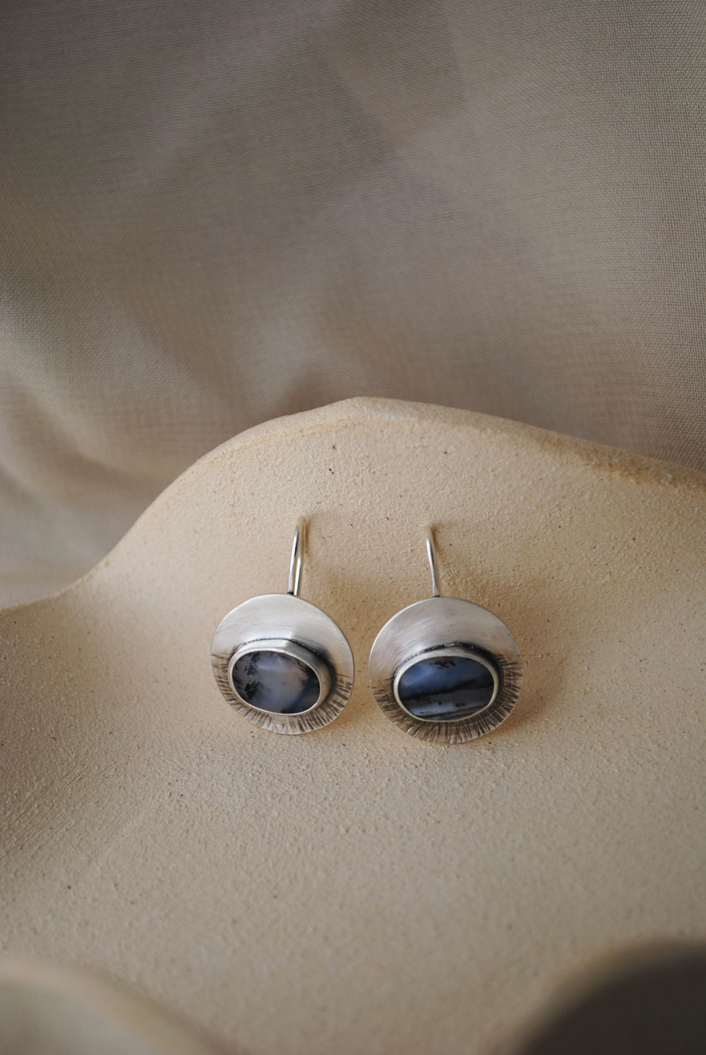 Pendientes de plata de ley 925 con gancho de anzuelo y ágatas dendríticas con un precioso paisaje invernal en sus dibujos. El Ágata dendrítica es una variedad única y fascinante del grupo de las ágatas. Se caracteriza por las inclusiones que parecen pequeños «árboles» o ramas, que se asemejan a estructuras dendríticas, de ahí su nombre. Estas inclusiones se deben a minerales como el hierro o el manganeso, que se incrustan en la piedra durante su formación. El acabado en plata mate refuerza el tono frío de las piedras para transportarnos a un espacio gélido como podría ser la tundra. Estos pendientes son un diseño original y una pieza única, no hay dos iguales.