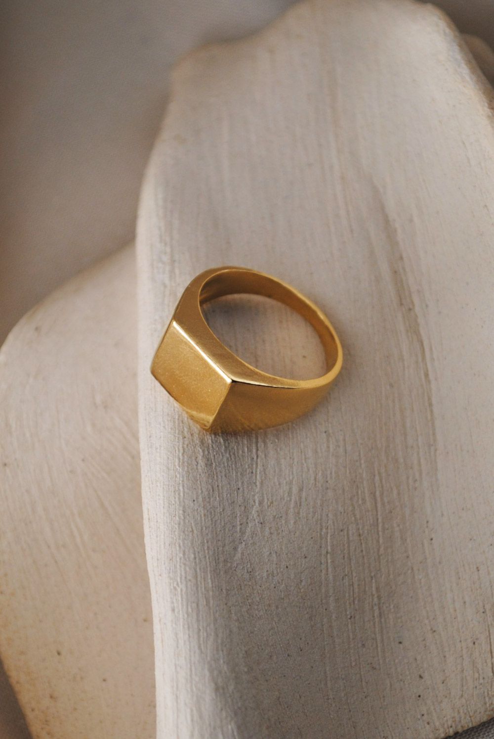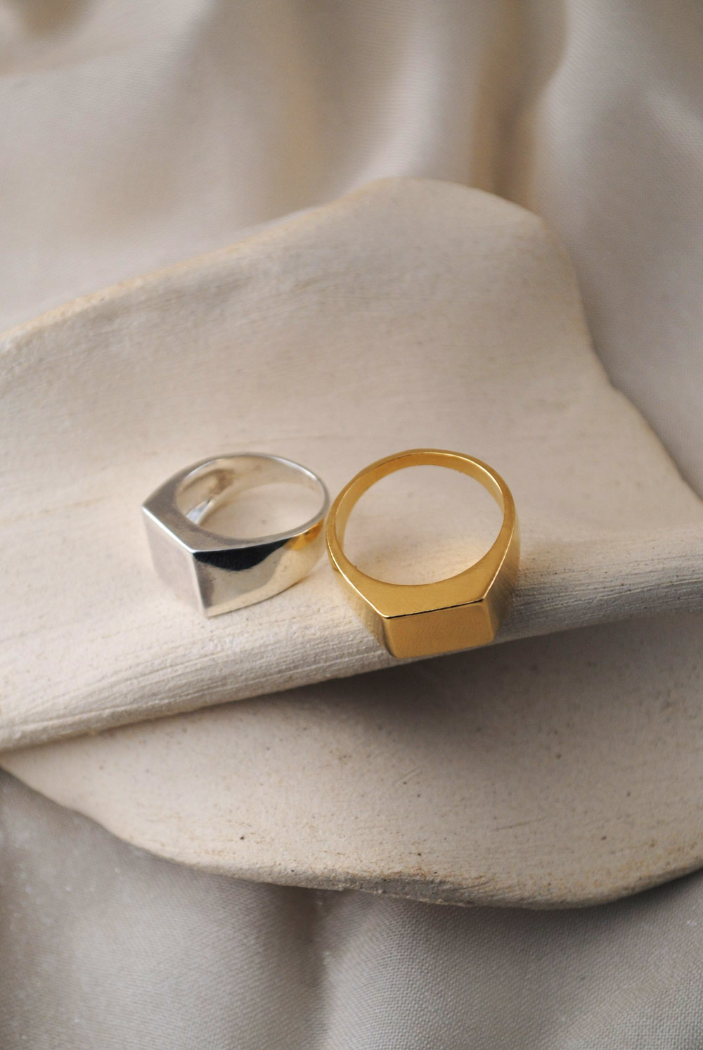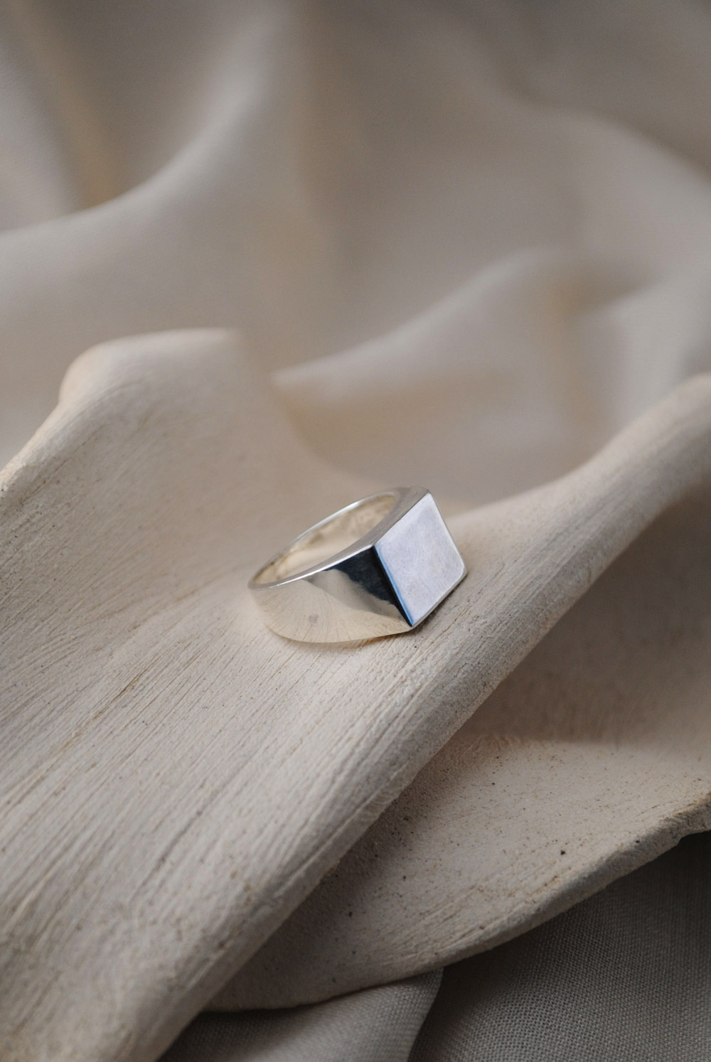 Este sello cuadrado es una pieza de joyería clásica y atemporal. Hecho de plata pulida, este anillo refleja la luz con un brillo sutil, lo que añade un toque de sofisticación a su diseño robusto. Disponible en plata de ley 925 bañada en oro.